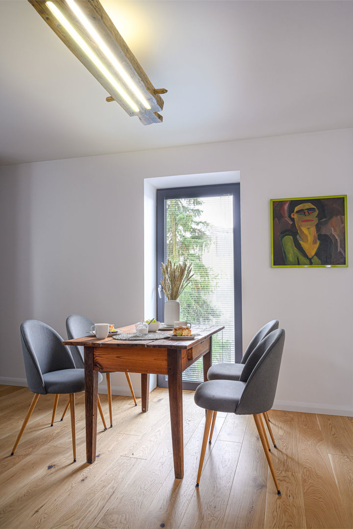 Apartament nr 1 ma elegancki charakter z akcentami rustykalnymi. Wnętrze jest jasne i przestronne. W pokoju dziennym są duże okna do samej podłogi oraz balkon z widokiem na ogród, na którym w ciepły dzień można napić się porannej kawy, a wieczorem delektować się kieliszkiem dobrego wina, ciesząc oczy widokiem pięknie podświetlonych drzew.